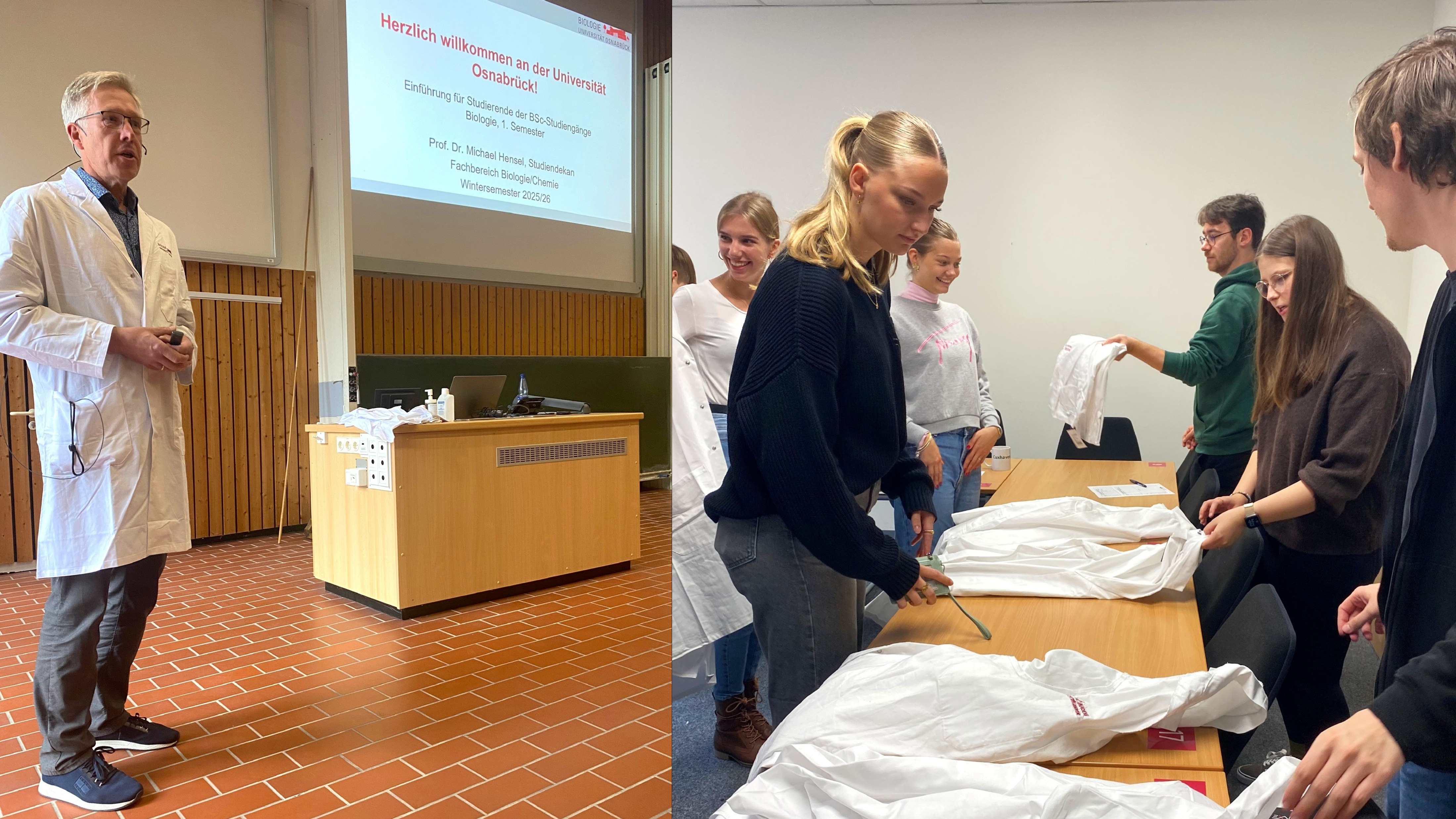 Links: Studiendekan Prof. Dr. Michael Hensel präsentiert den Erstsemesterstudierenden den bestickten Laborkittel. Rechts: Die Fachschaft gibt die Laborkittel an die neuen Bachelorstudierenden aus (Fotos: Laura Elpers | Universität Osnabrück)