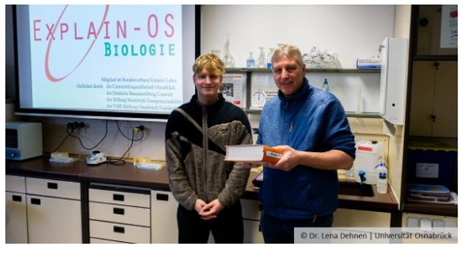 In den bereits 16 Jahren hat der wissenschaftliche Leiter des „Explain-OS“, PD Dr. Knut Jahreis, viele Schulklassen und -kurse für die Biologie begeistern können, viele von ihnen auch nachhaltig. „Manchmal sieht man sich wieder“, freut sich Jahreis zu erzählen, „beispielsweise ist unsere im Jahr 2017 gekürte, 10.000. Besucherin des Lernlabors nach dem Abitur zum Biologiestudium wiedergekehrt und ist mittlerweile in ihrem Masterstudium angekommen“. Ebenso wie Benjamin, der nun frischgekürte 15.000. Schüler, hat auch sie damals eine Ausgabe des Biologiestandardwerks „Campbell“ überreicht bekommen. Mit diesem Biologielehrbuch, welches seit 2009 von den Lehrenden der Osnabrücker Biologie geschrieben und überarbeitet wird, hätte Benjamin auf jeden Fall ein solides Fundament für ein Biologiestudium. Vielleicht ja auch in Osnabrück?